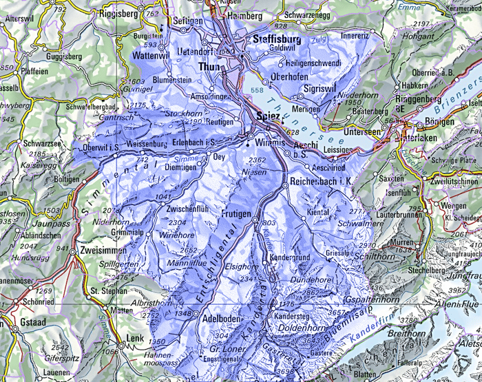 Thun, Steffisburg, Unterlangenegg, Heimenschwand, Schwarzenegg, Fahrni b. Thun, Süderen, Eriz, Innereriz, Homberg b. Thun, Teuffenthal b. Thun, Horrenbach, Buchen BE, Schwendibach, Goldiwil (Thun), Heiligenschwendi, Hünibach, Heimberg, Kienersrüti, Uttigen, Oppligen, Jaberg, Kiesen, Höfen b. Thun, Niederstocken, Oberstocken, Amsoldingen, Thierachern, Uebeschi, Längenbühl, Forst b. Längenbühl, Pohlern, Blumenstein, Gwatt (Thun), Zwieselberg, Einigen, Reutigen, Uetendorf, Seftigen, Gurzelen, Burgistein, Wattenwil, Spiez, Hondrich, Aeschiried, Aeschi b. Spiez, Krattigen, Faulensee, Leissigen, Därligen, Emdthal, Mülenen, Reichenbach im Kandertal, Wengi b. Frutigen, Frutigen, Adelboden, Kandergrund, Blausee-Mitholz, Kandersteg, Scharnachtal, Kiental, Ried (Frutigen), Achseten, Wimmis, Oey, Diemtigen, Horboden, Zwischenflüh, Schwenden im Diemtigtal, Latterbach, Erlenbach im Simmental, Därstetten, Weissenburg, Oberwil im Simmental, Boltigen